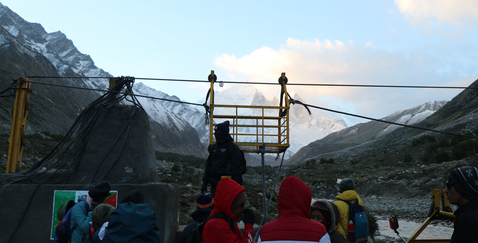 The next day was Tapovan day, the grueling climb that we had all heard about and dreaded from day one. Hike began around 5am in the morning, we had a light breakfast, packed our lunches and prepared for the river crossing session. Bhagirathi had to be crossed using a wire-trolley system that had been established by the government after the usual route to Gaumukh was wiped away from the cloud-burst at Uttarakhand.